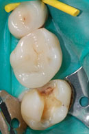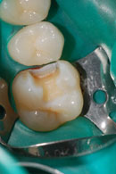 Das Komposit wird anschliessend schichtweise in die Kavität eingebracht und erneut mit Blaulicht ausgehärtet. Dies verhindert die Bildung von Randspalten infolge der unvermeidlichen Polymerisationsschrumpfung des Kunststoffes. Anschliessend erfolgt das Ausarbeiten und Polieren der Füllung.